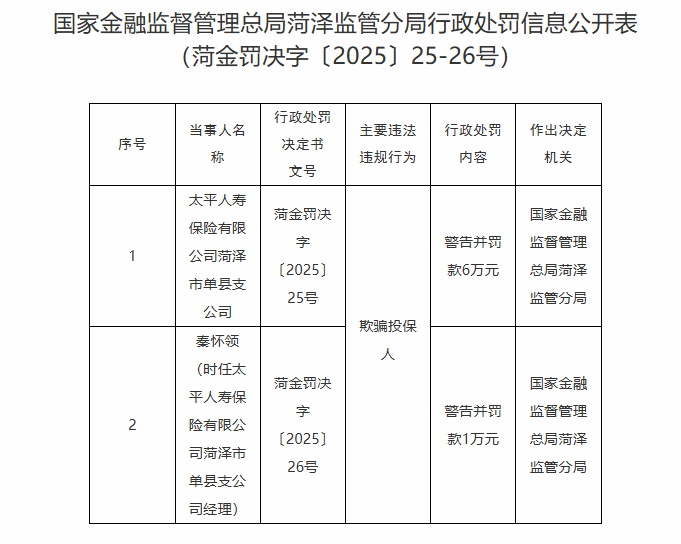 中国经济网络北京,8月22日新闻新闻赫兹州政府的财务监督和行政管理部门于18号发出了行政处罚的传播形式(Hejin Pentaly裁决号[2025]第25-26号)。 Taiping Life Insurance Co.,Ltd. Haze Shanxian分支机构和Qin Huailing(在Taiping人寿保险公司的Haze Shanxian分支机构的管理时)具有以下非法和不规则行为:雾霾监测的雾霾监控分支机构,该国金融公司的政府和警告发行了战争和泰普(Taiping and Taiping Life)。 Ltd.阴霾。他决定罚款10,000元。原始文本如下所示。